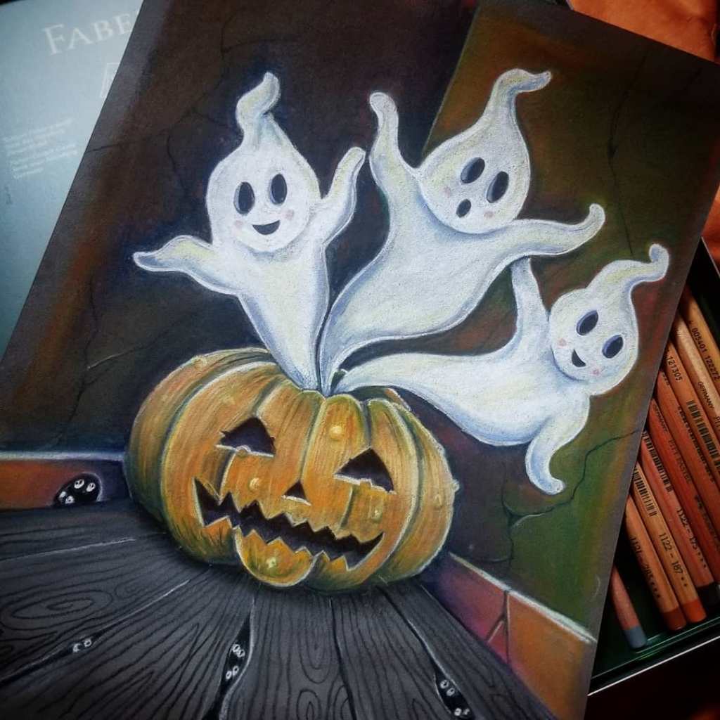 I was stuck at home watching Ghost Adventures and I did bring out the pastel pencils (which I have not used for awhile) and created a spooky picture of ghosts coming out of a pumpkin). This was such an unusual Halloween, I should have been in a haunted castle doing a ghost hunt, carving pumpkins and just having fun 😦